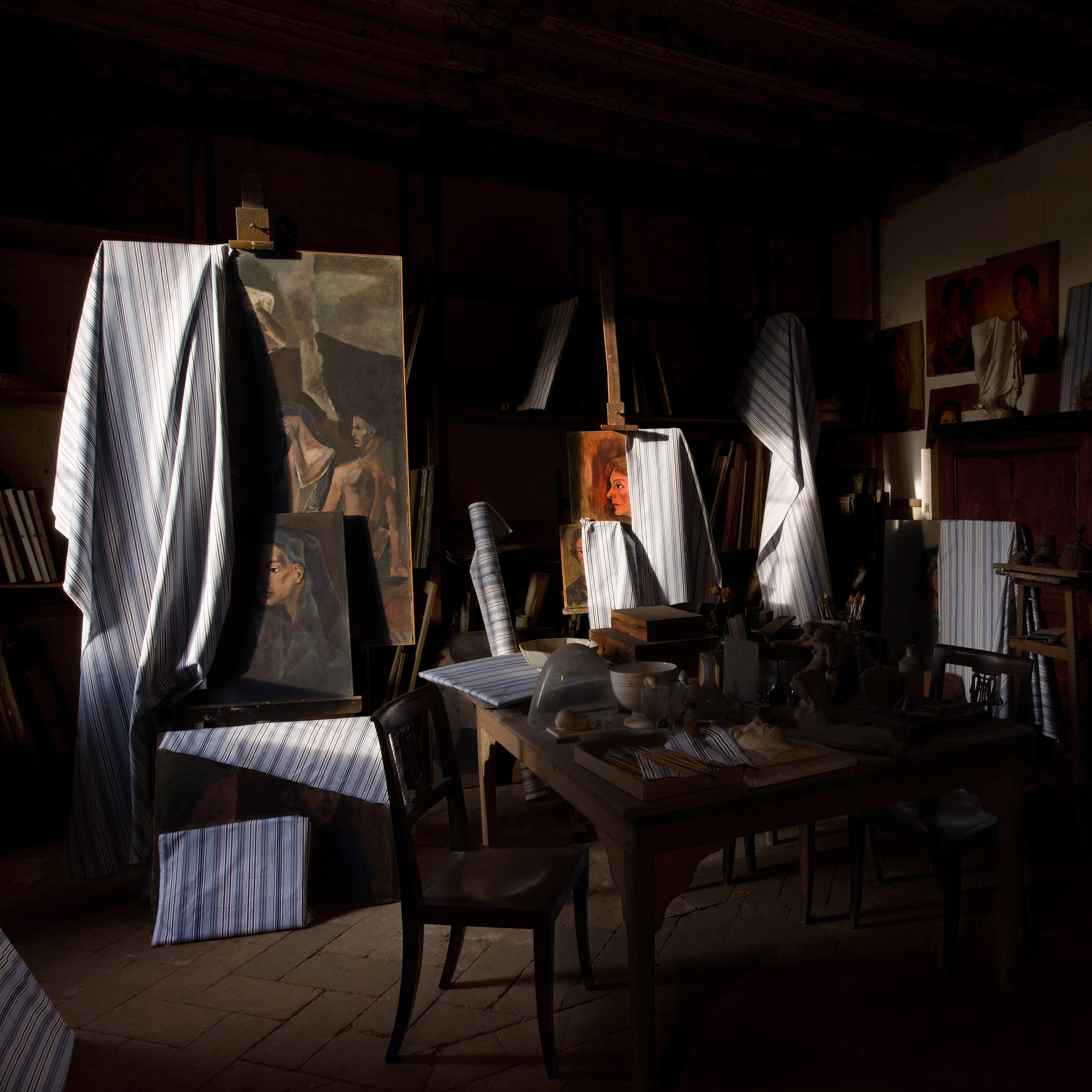 You pass by faded frescoes on the walls. The murals seem to sway in the wavering candlelight. “The shadows are not as benign as they seem,” he warns. “This castle has swallowed people whole. There have been disappearances.” He speaks so plainly, you wonder if he’s teasing you. His tone is difficult to decipher, his face turned away, his heels tapping the stone floor in a fast clip as you struggle to keep up. He stops, and you’re suddenly aware that you’ve followed him into a room cluttered with shrouded canvases.