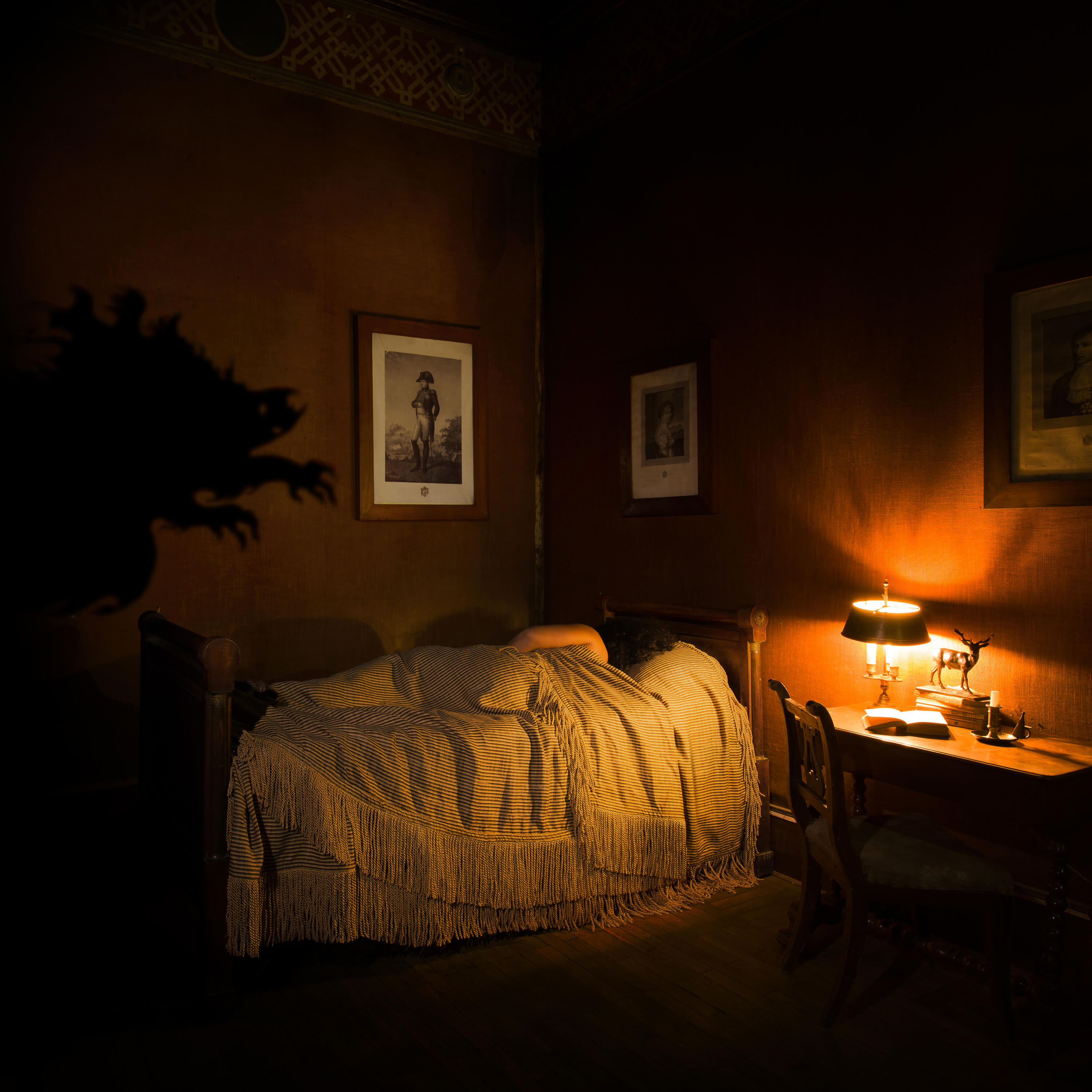 In the midst of these visions, it takes great effort to rise from the chaise. A shrill wind enters the room and holds you back. Standing to walk to the door, you feel as if you’re being split in two. You make your way to the hall, where the wind suddenly ceases. Exhausted, you stumble through the first open door into a chamber furnished sparely with a bed and desk. Ancestral portraits hang on the walls. You collapse into the bed, and a feverish sleep overtakes you.