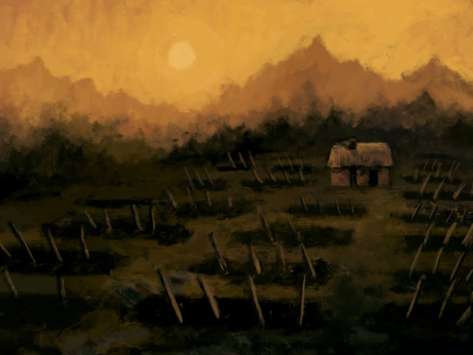 Light snow coated the remains of what would have been his harvest, its gourds and greens melted to a swamp-like slurry from which emerged the occasional round fragment of still-solid plant matter. The stump of the apple tree was blackened at the top but no longer smoking; the rest of the trunk lay in pieces by its side, its tips carbonized like a petrified monument.